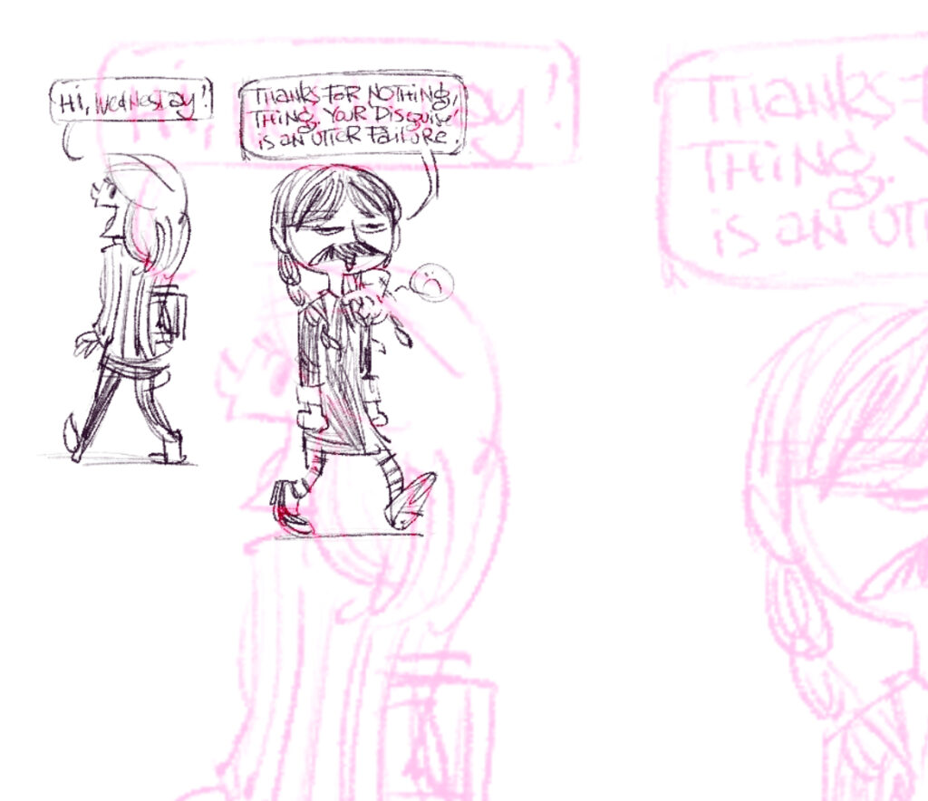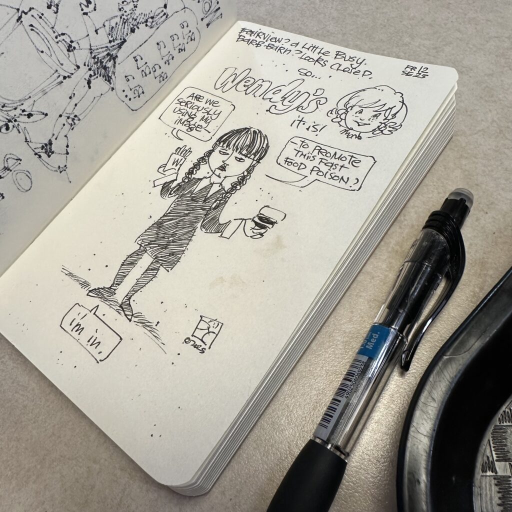 I was inspired after stopping at a Wendy’s restaurant after a shopping trip last weekend. I didn’t want to sit in a restaurant staring at my phone while eating. (I really am trying to cut back on mindless social media consumption these days.) So I brought a sketchbook and a pen and thought I would doodle during dinner. Because Wendy’s was having a cross-promotion with Netflix’s Wednesday, they had branded packaging and other display promos all over the place. Of note was a sleeve for their fries, decorated with purple stripes and a school crest with an initial W on it.