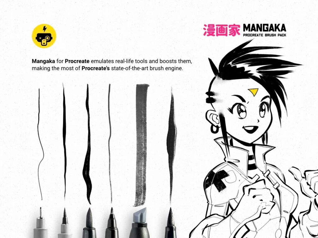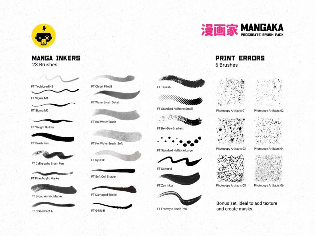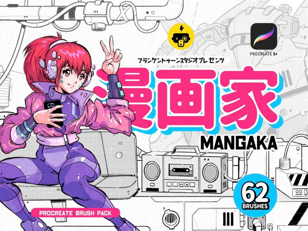 The latest set I’ve purchased is an older product called Mangaka which includes many liners, washes plus halftones and textures that evoke the manga aesthetic look.